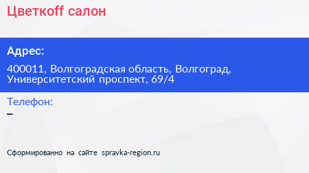 Цветкоff, салон по адресу 400011, Волгоградская область, Волгоград, Университетский проспект, 69/4 в дальнейшем Организация, размещена в следующих категориях: