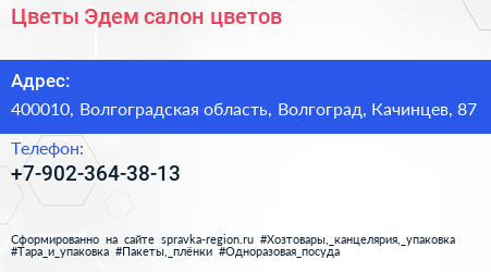 Цветы-Эдем, салон цветов по адресу 400010, Волгоградская область, Волгоград, Качинцев, 87 в дальнейшем Организация, размещена в следующих категориях: