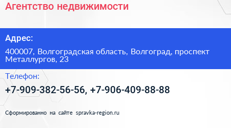 Агентство недвижимости по адресу 400007, Волгоградская область, Волгоград, проспект Металлургов, 23 в дальнейшем Организация, размещена в следующих категориях: