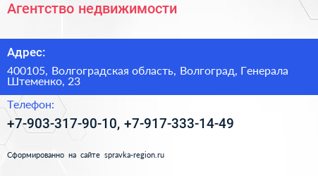 Агентство недвижимости по адресу 400105, Волгоградская область, Волгоград, Генерала Штеменко, 23 в дальнейшем Организация, размещена в следующих категориях: