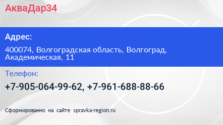 АкваДар34 по адресу 400074, Волгоградская область, Волгоград, Академическая, 11 в дальнейшем Организация, размещена в следующих категориях: