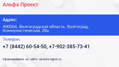 Альфа-Проект по адресу 400066, Волгоградская область, Волгоград, Коммунистическая, 28а в дальнейшем Организация, размещена в следующих категориях: