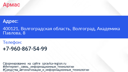 Армас по адресу 400121, Волгоградская область, Волгоград, Академика Павлова, 8 в дальнейшем Организация, размещена в следующих категориях: