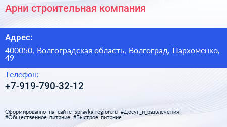 Арни, строительная компания по адресу 400050, Волгоградская область, Волгоград, Пархоменко, 49 в дальнейшем Организация, размещена в следующих категориях: