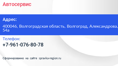 Автосервис по адресу 400046, Волгоградская область, Волгоград, Александрова, 54а в дальнейшем Организация, размещена в следующих категориях: