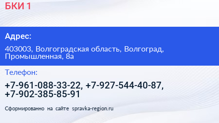 БКИ №1 по адресу 403003, Волгоградская область, Волгоград, Промышленная, 8а в дальнейшем Организация, размещена в следующих категориях: