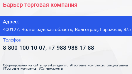 Барьер, торговая компания по адресу 400127, Волгоградская область, Волгоград, Гаражная, 8/5 в дальнейшем Организация, размещена в следующих категориях:
