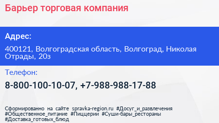 Барьер, торговая компания по адресу 400121, Волгоградская область, Волгоград, Николая Отрады, 20з в дальнейшем Организация, размещена в следующих категориях: