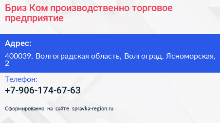 Бриз Ком, производственно-торговое предприятие по адресу 400039, Волгоградская область, Волгоград, Ясноморская, 2 в дальнейшем Организация, размещена в следующих категориях: