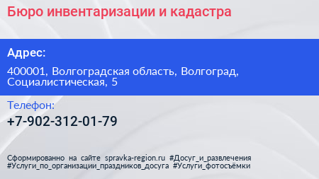Бюро инвентаризации и кадастра по адресу 400001, Волгоградская область, Волгоград, Социалистическая, 5 в дальнейшем Организация, размещена в следующих категориях: