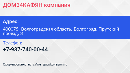 ДОМ34КАФЯН, компания по адресу 400075, Волгоградская область, Волгоград, Прутский проезд, 3 в дальнейшем Организация, размещена в следующих категориях: