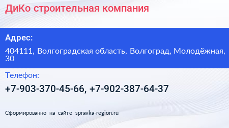 ДиКо, строительная компания по адресу 404111, Волгоградская область, Волгоград, Молодёжная, 30 в дальнейшем Организация, размещена в следующих категориях: