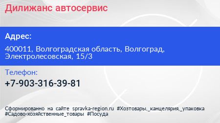 Дилижанс, автосервис по адресу 400011, Волгоградская область, Волгоград, Электролесовская, 15/3 в дальнейшем Организация, размещена в следующих категориях: