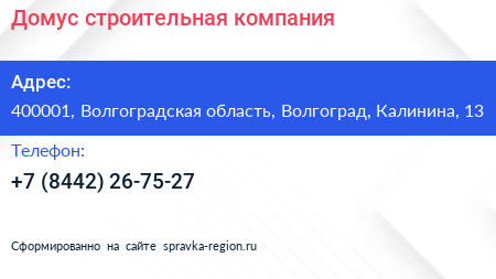 Домус, строительная компания по адресу 400001, Волгоградская область, Волгоград, Калинина, 13 в дальнейшем Организация, размещена в следующих категориях: