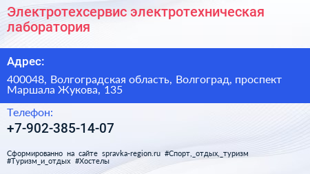 Электротехсервис, электротехническая лаборатория по адресу 400048, Волгоградская область, Волгоград, проспект Маршала Жукова, 135 в дальнейшем Организация, размещена в следующих категориях: