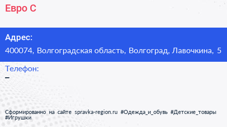Евро-С по адресу 400074, Волгоградская область, Волгоград, Лавочкина, 5 в дальнейшем Организация, размещена в следующих категориях:
