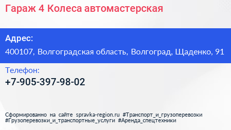 Гараж 4 Колеса, автомастерская по адресу 400107, Волгоградская область, Волгоград, Щаденко, 91 в дальнейшем Организация, размещена в следующих категориях: