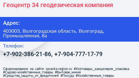 Геоцентр-34, геодезическая компания по адресу 403003, Волгоградская область, Волгоград, Промышленная, 8а в дальнейшем Организация, размещена в следующих категориях:
