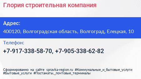 Глория, строительная компания по адресу 400120, Волгоградская область, Волгоград, Елецкая, 10 в дальнейшем Организация, размещена в следующих категориях: