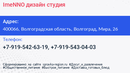 ImeNNO, дизайн-студия по адресу 400066, Волгоградская область, Волгоград, Мира, 26 в дальнейшем Организация, размещена в следующих категориях: