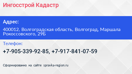 Ингосстрой-Кадастр по адресу 400012, Волгоградская область, Волгоград, Маршала Рокоссовского, 29Б в дальнейшем Организация, размещена в следующих категориях: