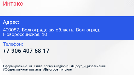 Интэкс по адресу 400087, Волгоградская область, Волгоград, Новороссийская, 10 в дальнейшем Организация, размещена в следующих категориях:
