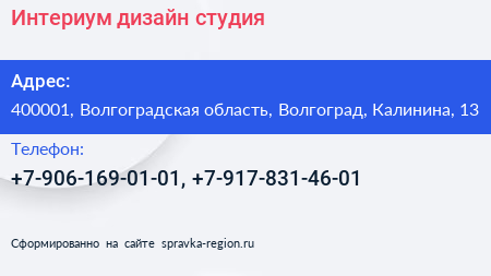 Интериум, дизайн-студия по адресу 400001, Волгоградская область, Волгоград, Калинина, 13 в дальнейшем Организация, размещена в следующих категориях: