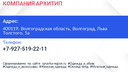 КОМПАНИЯ АРХИТИП по адресу 400119, Волгоградская область, Волгоград, Льва Толстого, 5а в дальнейшем Организация, размещена в следующих категориях: