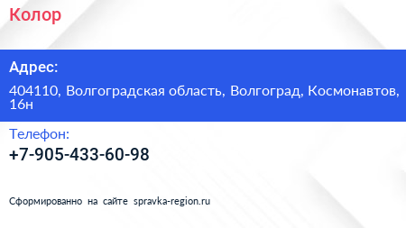 Колор по адресу 404110, Волгоградская область, Волгоград, Космонавтов, 16н в дальнейшем Организация, размещена в следующих категориях: