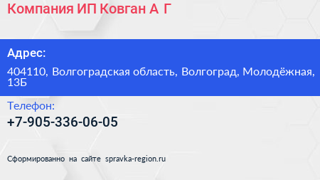 Компания, ИП Ковган А.Г. по адресу 404110, Волгоградская область, Волгоград, Молодёжная, 13Б в дальнейшем Организация, размещена в следующих категориях: