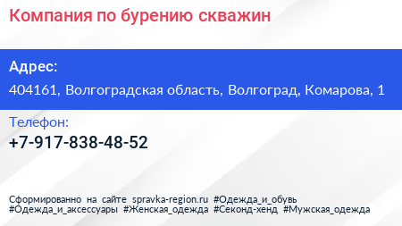 Компания по бурению скважин по адресу 404161, Волгоградская область, Волгоград, Комарова, 1 в дальнейшем Организация, размещена в следующих категориях: