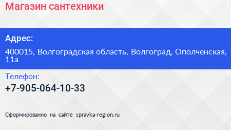Магазин сантехники по адресу 400015, Волгоградская область, Волгоград, Ополченская, 11а в дальнейшем Организация, размещена в следующих категориях: