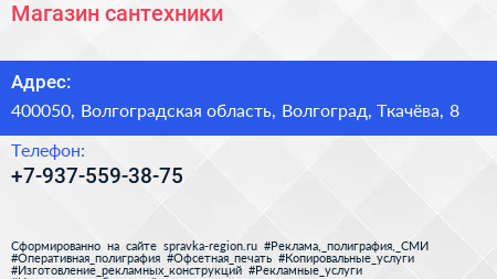 Магазин сантехники по адресу 400050, Волгоградская область, Волгоград, Ткачёва, 8 в дальнейшем Организация, размещена в следующих категориях: