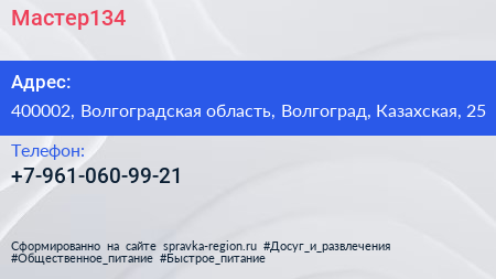 Мастер134 по адресу 400002, Волгоградская область, Волгоград, Казахская, 25 в дальнейшем Организация, размещена в следующих категориях: