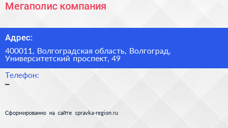 Мегаполис, компания по адресу 400011, Волгоградская область, Волгоград, Университетский проспект, 49 в дальнейшем Организация, размещена в следующих категориях: