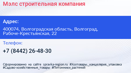 Мэлс, строительная компания по адресу 400074, Волгоградская область, Волгоград, Рабоче-Крестьянская, 22 в дальнейшем Организация, размещена в следующих категориях: