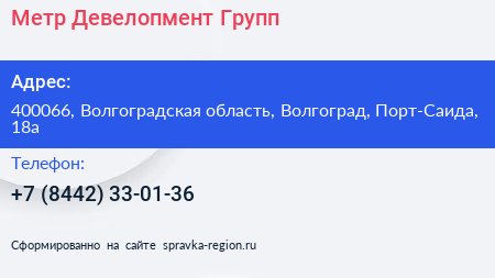 Метр Девелопмент Групп по адресу 400066, Волгоградская область, Волгоград, Порт-Саида, 18а в дальнейшем Организация, размещена в следующих категориях: