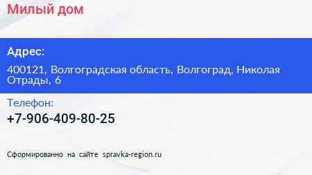 Милый дом по адресу 400121, Волгоградская область, Волгоград, Николая Отрады, 6 в дальнейшем Организация, размещена в следующих категориях: