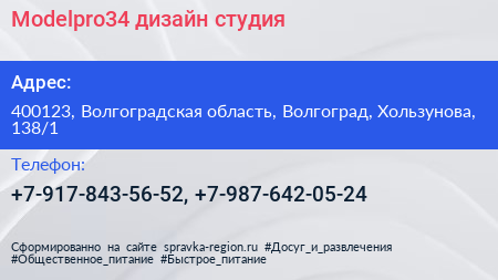 Modelpro34, дизайн-студия по адресу 400123, Волгоградская область, Волгоград, Хользунова, 138/1 в дальнейшем Организация, размещена в следующих категориях: