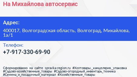 На Михайлова, автосервис по адресу 400017, Волгоградская область, Волгоград, Михайлова, 1а/1 в дальнейшем Организация, размещена в следующих категориях: