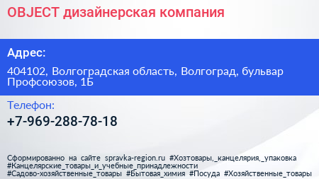 OBJECT, дизайнерская компания по адресу 404102, Волгоградская область, Волгоград, бульвар Профсоюзов, 1Б в дальнейшем Организация, размещена в следующих категориях: