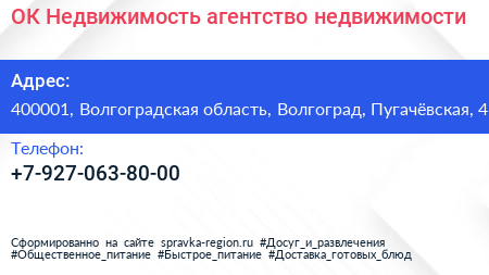 ОК Недвижимость, агентство недвижимости по адресу 400001, Волгоградская область, Волгоград, Пугачёвская, 4 в дальнейшем Организация, размещена в следующих категориях: