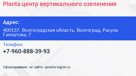 Planta, центр вертикального озеленения по адресу 400137, Волгоградская область, Волгоград, Расула Гамзатова, 7 в дальнейшем Организация, размещена в следующих категориях: