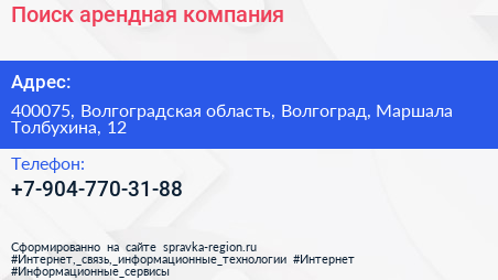 Поиск, арендная компания по адресу 400075, Волгоградская область, Волгоград, Маршала Толбухина, 12 в дальнейшем Организация, размещена в следующих категориях: