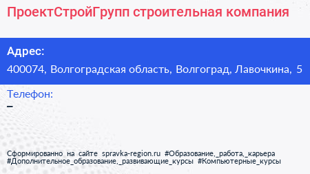 ПроектСтройГрупп, строительная компания по адресу 400074, Волгоградская область, Волгоград, Лавочкина, 5 в дальнейшем Организация, размещена в следующих категориях: