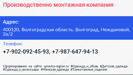 Производственно-монтажная компания по адресу 400120, Волгоградская область, Волгоград, Неждановой, 2а/2 в дальнейшем Организация, размещена в следующих категориях: