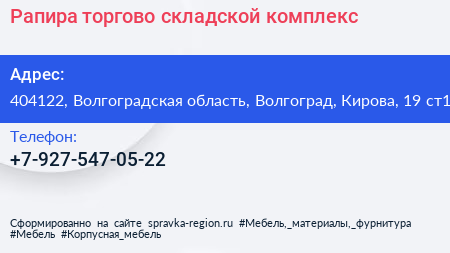 Рапира, торгово-складской комплекс по адресу 404122, Волгоградская область, Волгоград, Кирова, 19 ст1 в дальнейшем Организация, размещена в следующих категориях:
