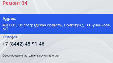 Ремонт-34 по адресу 400001, Волгоградская область, Волгоград, Канунникова, 6/1 в дальнейшем Организация, размещена в следующих категориях: