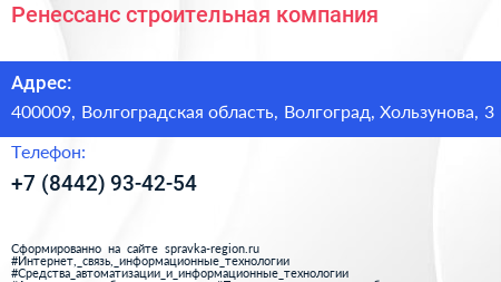 Ренессанс, строительная компания по адресу 400009, Волгоградская область, Волгоград, Хользунова, 3 в дальнейшем Организация, размещена в следующих категориях: