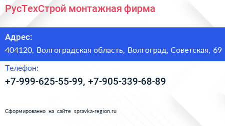 РусТехСтрой, монтажная фирма по адресу 404120, Волгоградская область, Волгоград, Советская, 69 в дальнейшем Организация, размещена в следующих категориях: